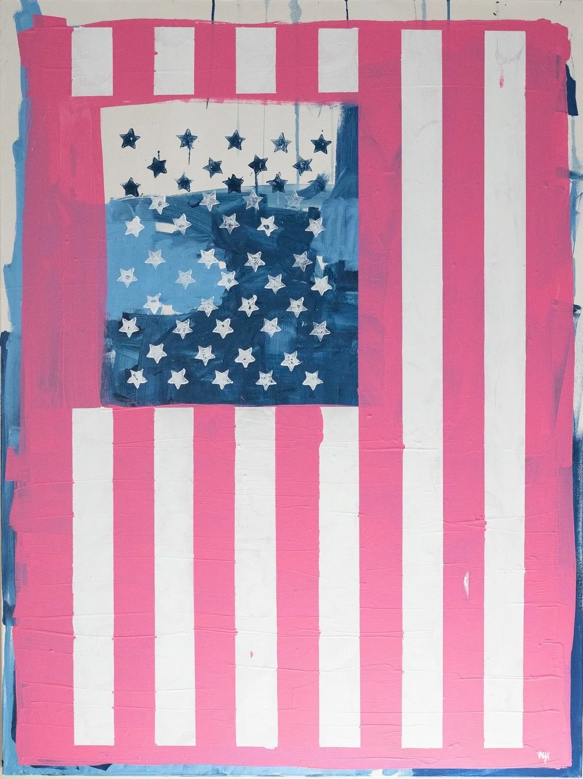 Deeply layered abstraction of the America flag. Hot pink stripes replace red, with stamped stars.